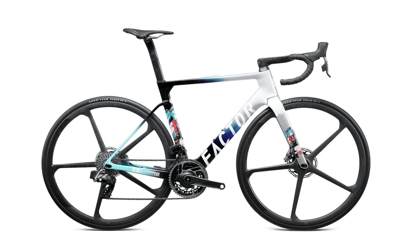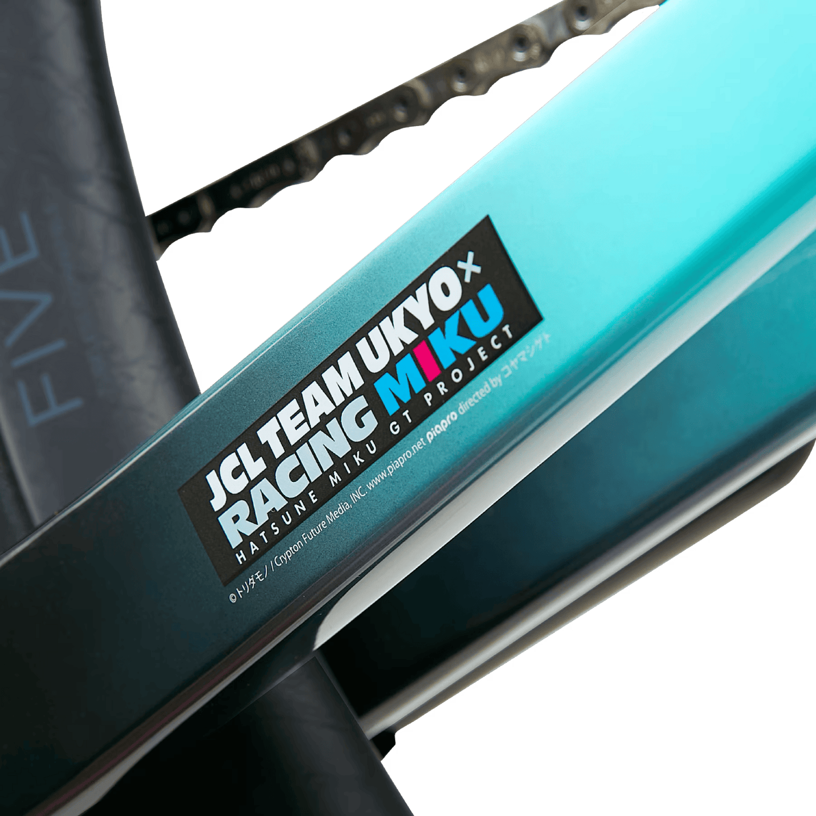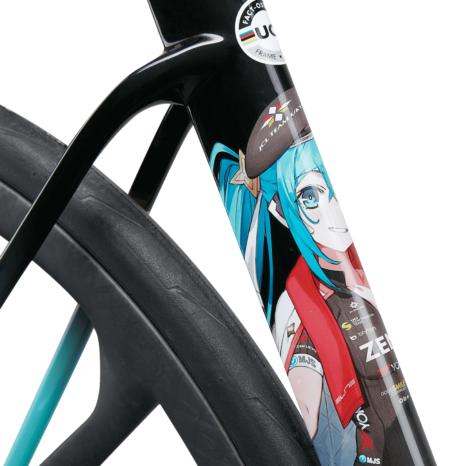 Ce n'est pas la première incursion de Miku dans le monde du sport ; elle a également figuré sur des véhicules de sport automobile Super GT. En fait, l'implication de Miku dans les sports mécaniques a inspiré le design utilisé sur les voitures OSTRO VAM et HANZŌ. Les couleurs de base font référence aux surfaces métalliques et en fibre de carbone des anciennes voitures de course GT3000 de l'équipe, tandis que l'argent métallique et le noir brillant évoquent la vitesse et la performance. Le turquoise utilisé est une citation directe de la chevelure fluide de Hastune Miku. Combinés ensemble, le design et les couleurs donnent une impression de mouvement. Pour mettre en valeur l'ensemble du cadre, l'imagerie détaillée du tube de selle et de la fourche permet d'obtenir des vélos de course vraiment originau